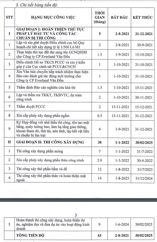 Theo đó, giai đoạn 1, chủ đầu tư phải hoàn thành thủ tục pháp lý đầu tư và công tác chuẩn bị thi công, thời gian bắt đầu từ tháng 8/2021 đến hết tháng 12/2021; giai đoạn 2 thi công xây dựng, thời gian bắt đầu từ đầu năm 2022 đến tháng 2/2025.
